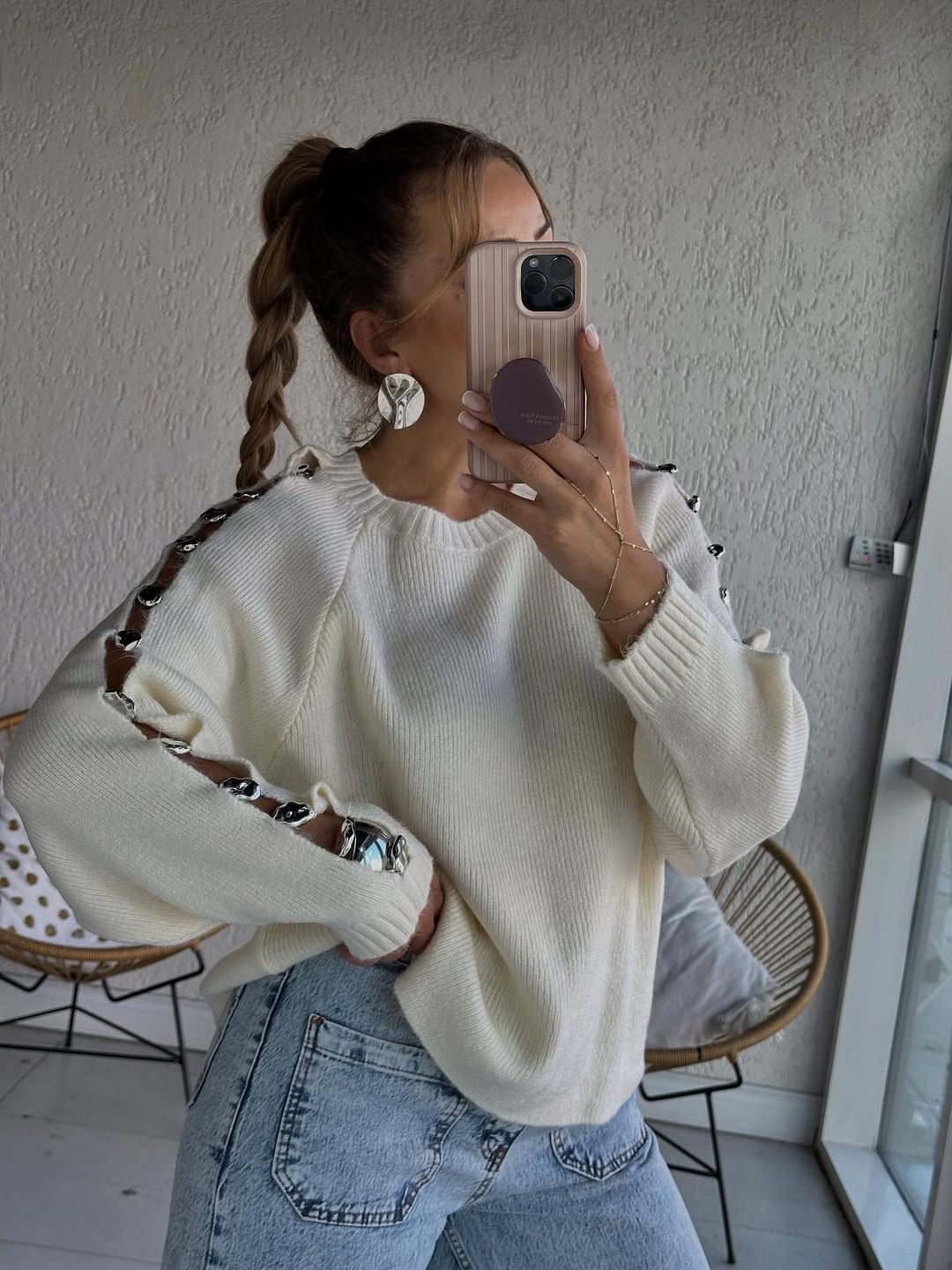 Cream knit sweater with lace-up metallic sleeve details