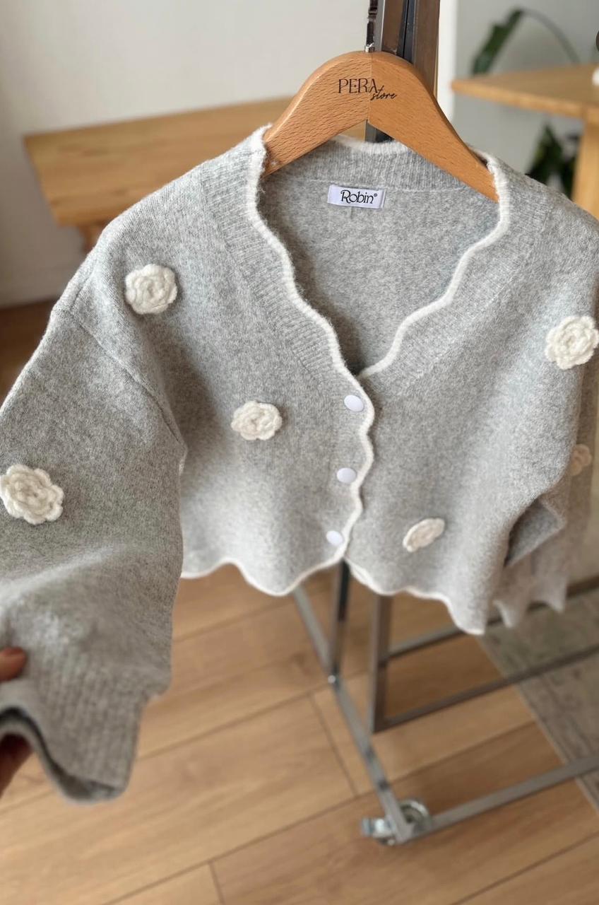 Light Grey Knit Cardigan With Flower Appliqué