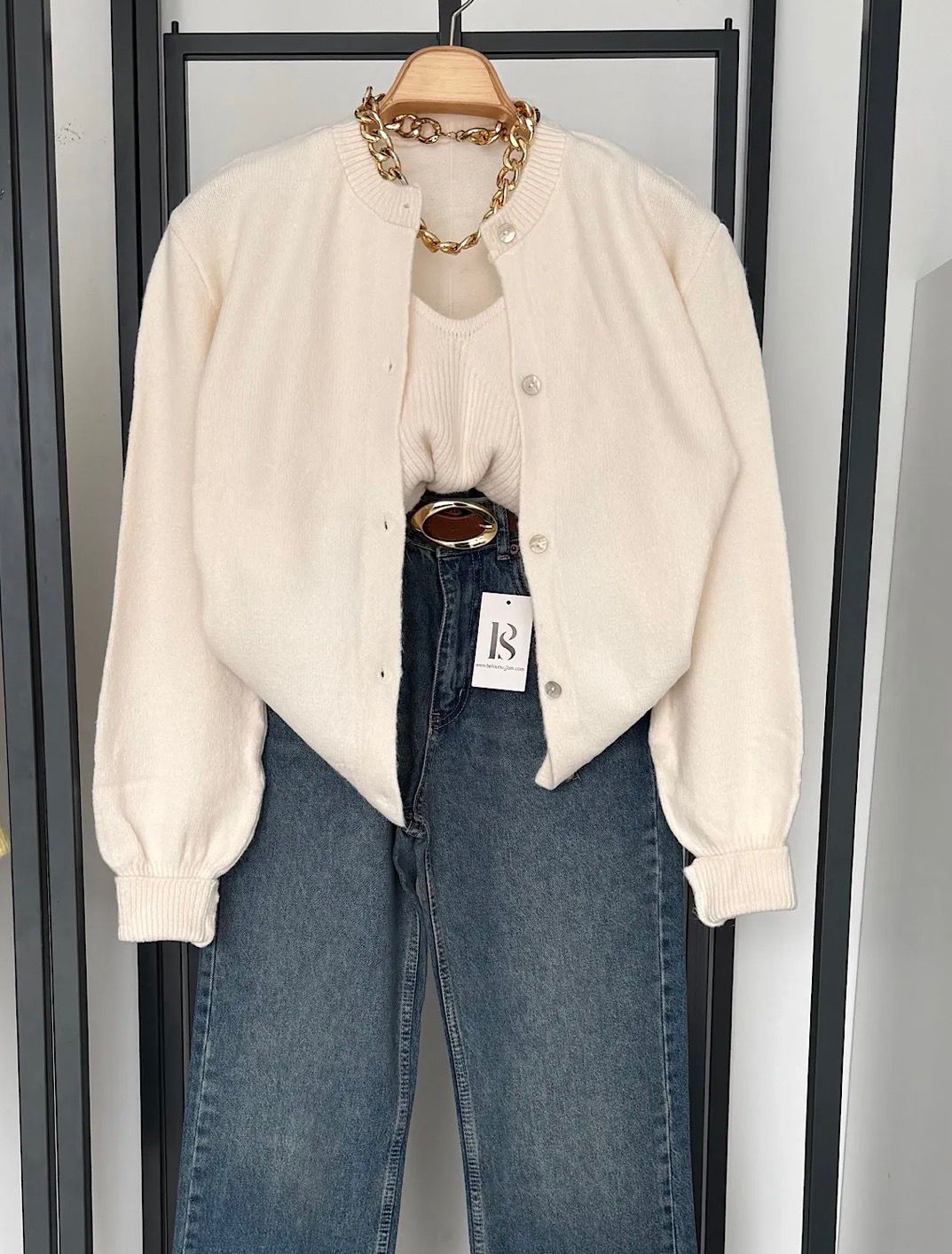 Cream cardigan with gold buttons and front pockets