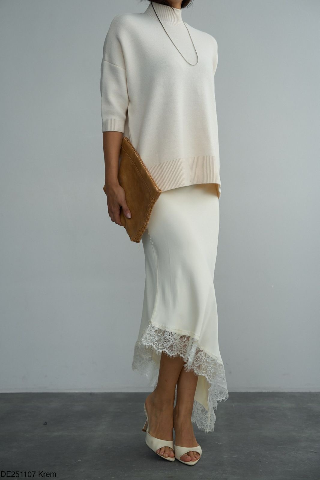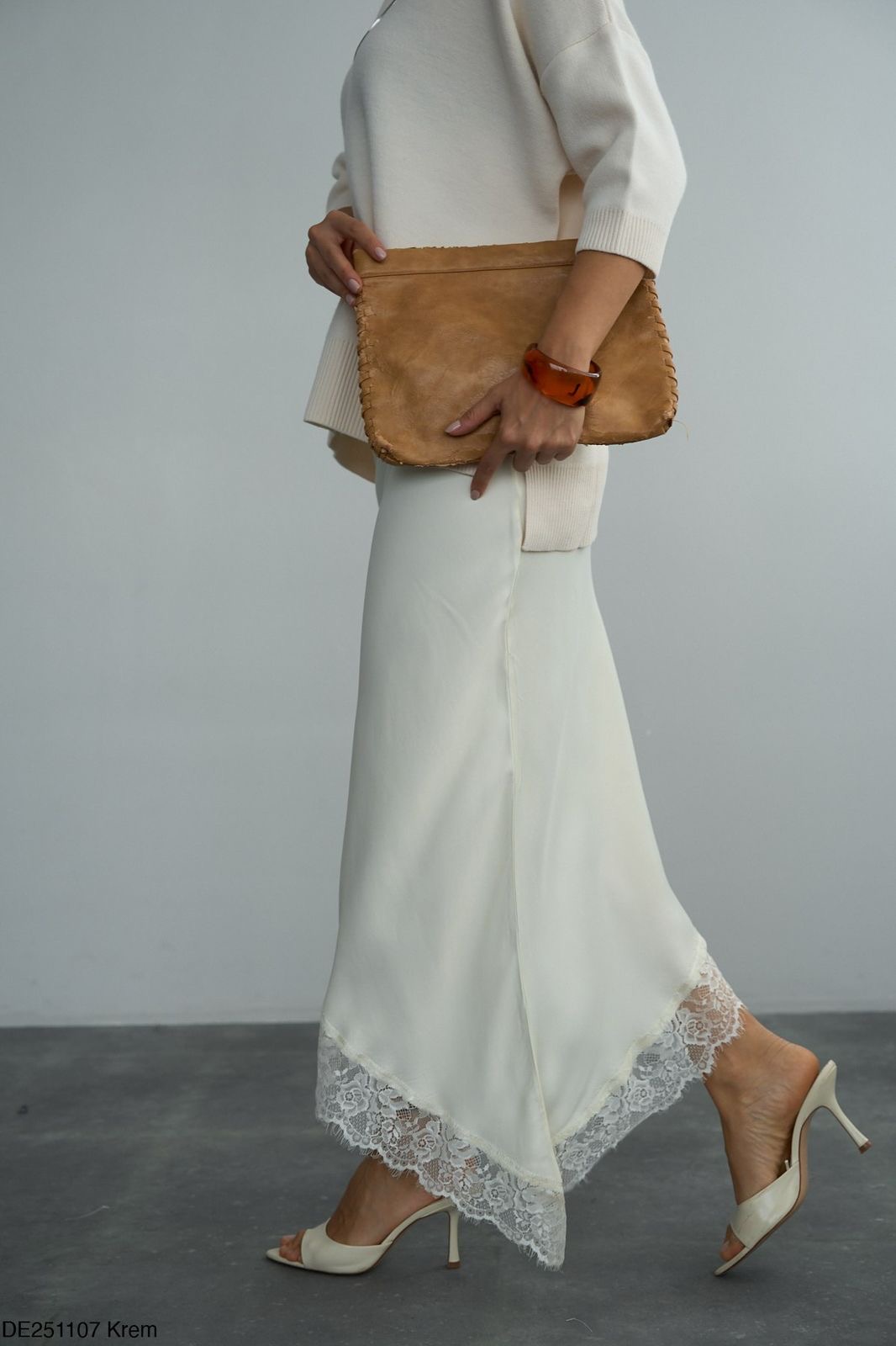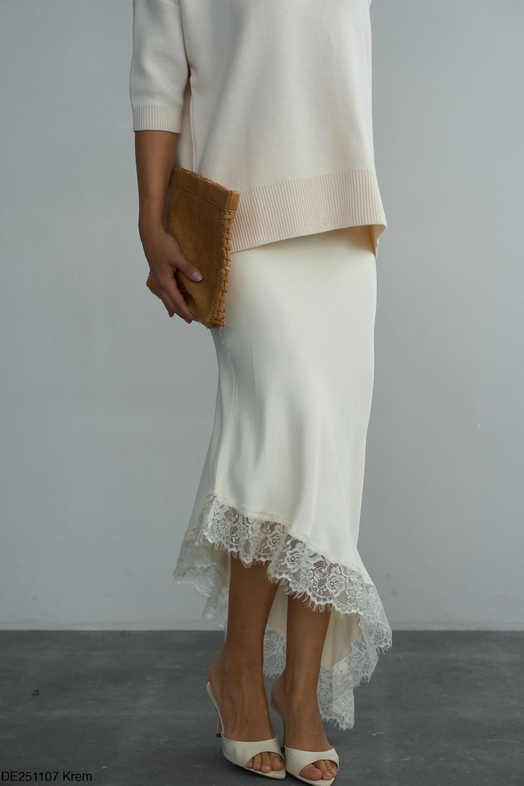 White satin slip skirt with lace trim