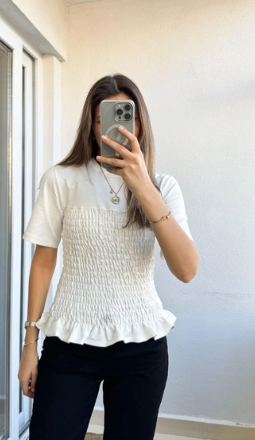 White Smocked Short Sleeve Top