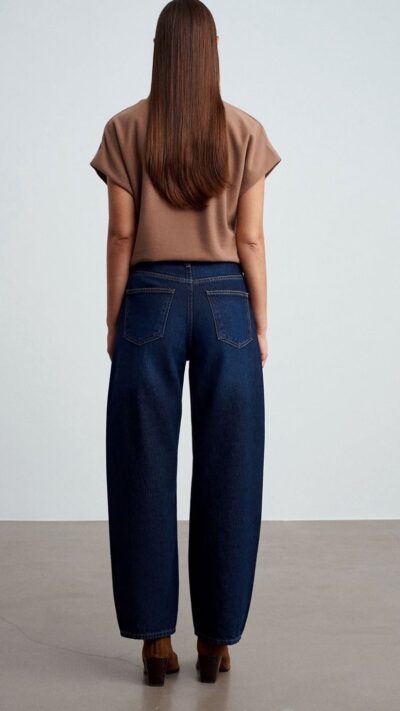 Wide leg blue jeans with a built in denim belt
